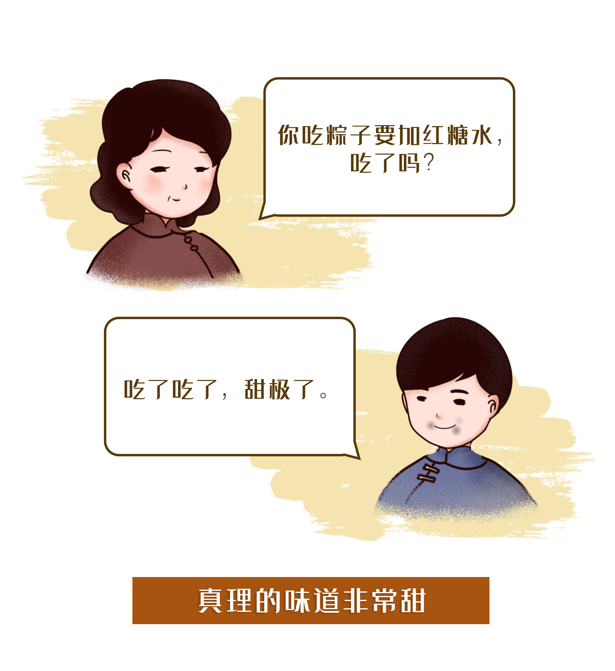 一天,一個小伙子在家里奮筆疾書,媽媽在外面喊著說:“你吃粽子要加紅糖水,吃了嗎?”他說:“吃了吃了,甜極了。”老太太進門一看,這個小伙子埋頭寫書,嘴上全是黑墨水。結(jié)果吃錯了,他旁邊一碗紅糖水沒喝,卻把那個墨水給喝了,而他渾然不覺,還說,“可甜了可甜了”。這人是誰呢?就是陳望道,他當時在浙江義烏的家里,就是寫這本書。于是由此就說了一句話:真理的味道非常甜。