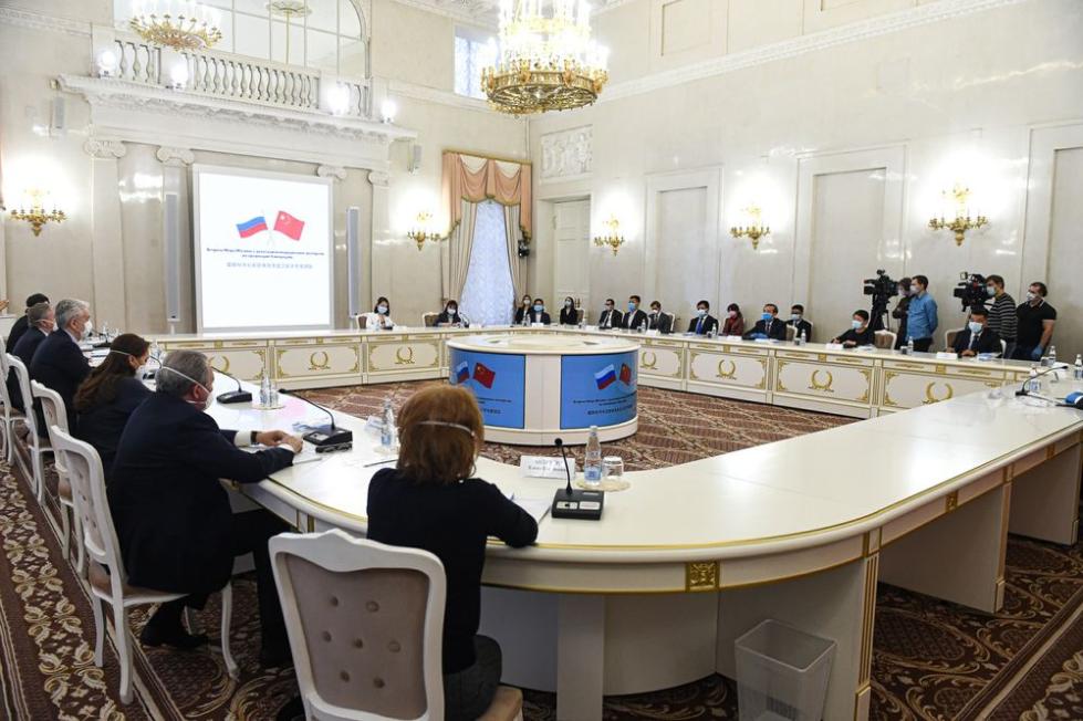 2020年4月13日,在俄羅斯首都莫斯科,中國抗疫醫療專家組與莫斯科市長索比亞寧會面。新華社發(葉甫蓋尼·西尼岑攝)